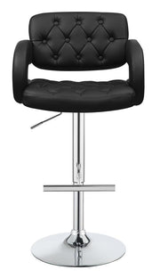 Expressive and interesting design elements team up to deliver a fun look. Make a modern or transitional space flush with style. This bar stool borrows from a retro theme with a hint of barbershop charm. An ergonomically positive seat, back, and arms encased in black upholstery match with virtually any palette. A bright, shiny chrome base with a bar footrest looks sleek and dynamic, and adjustable seat heights accommodate a bar table or counter.