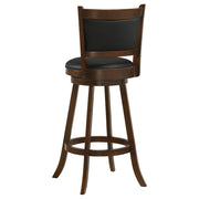 This versatile bar stool is the perfect addition to your rec room or home bar. Whether sipping a beer between billiards games or during Sunday afternoon football, you'll be a champ on this rich chestnut wood stool. Switch from talking strategy to grabbing chips for dip on the plush swivel seat. The angled legs and supporting round footrest are sturdy enough for leaning forward when the game hangs in the balance. At a comfortable bar height and with padded seat and backrest, you'll enjoy it all in comfort and style. Key Features: • Versatile chestnut wood bar stool perfect for rec room or home bar; swivel seat and angled legs with round footrest for stability • Plush padded seat and backrest for comfort at bar height • Ideal for sipping beer between billiards games or during Sunday afternoon football • Sturdy enough for leaning forward when the game hangs in the balance • Enjoy in comfort and style