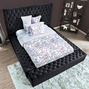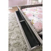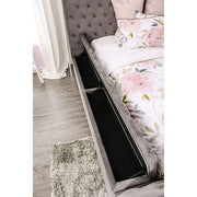 This bed set from the Davida Collection is a contemporary masterpiece. This platform bed is upholstered in a button-tufted flannelette from top to bottom, emphasizing the bold, chunky design. The footboard also acts as additional storage, pulling out on rails for ample organization space. With a sturdy design, this bed will be the centerpiece of your modern room for years to come.