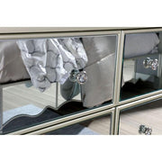 ELIORA Cal.King Bed, 94 1/8"L X 80 3/4"W X 68"H, 239.8lbs. Glamor and shine have never looked as good as it does with this bedroom set from the Eliora Collection. Everything about this set sparkles. The silvery headboard is padded and button-tufted with crystal acrylic buttons. The matching dresser and night stand include a silver finish and crystal drawer knobs. With ornate accents and curved feet, this chic set will make you feel like royalty.