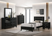 For a minimalistic space, this ensemble sets the perfect tone. With a sleek high gloss finish, each piece exudes a sense of confidence that's hard to ignore. The straight and sleek lines highlight the simple silhouettes, interrupted only by its hallmark feature--glitter-filled panel gaps in the headboard and the case goods that add just enough glam to this stunner of a set.