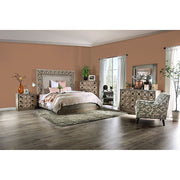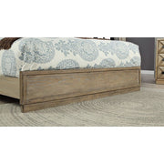 There's something about a tall headboard that just adds class to a bedroom. The combination of a foam padded fabric and carved x-shaped details plays with contrasting textures for a beautiful visual backdrop. The matching case goods feature matching carved drawer faces with dark square hardware that stands out against the weathered light oak finish. This bedroom set combines a touch of rustic wood with contemporary wood carving and fabric, allowing it to match any design direction you take.