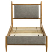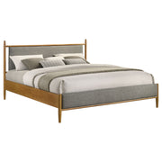 Elevate your retreat with this platform bed, where warm wood and tailored upholstery meet in harmony. The clean-lined frame highlights its mid-century modern influence, paired with a gently padded headboard for cushioned support. Crafted from rubberwood, engineered wood, and foam-filled fabric, it ensures stability without the need for a foundation. Ideal for restful nights and timeless style, this platform bed blends structure with soft sophistication. Key Features: • Queen platform bed with clean lines and padded headboard for tailored support • Light brown frame highlights wood grain for warmth and mid-century character • Streamlined silhouette blends retro charm with modern minimalism for versatility • Foam-filled fabric upholstery softens the look with subtle texture and comfort • Crafted from rubberwood and engineered wood for lasting strength and stability • Foundation-free platform design with supportive slats for reliable mattress use