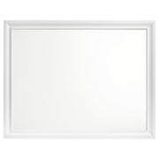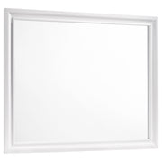 Exceptionally designed for transitional bedrooms, this five-piece bedroom set includes a panel bed frame, single two-drawer nightstand, five-drawer chest, and seven-drawer dresser with mirror, all in a crisp white finish with shiny metal hardware with faceted crystal accents. The paneled headboard and footboard offer channel tufted paneling wrapped in a metallic leatherette upholstery. Other extra touches include frame molding, turned feet, and felt lined top drawers. The nightstand offers a convenient power outlet for charging devices before bed. Place this bedroom set in a home to lend a more glamorous vibe.