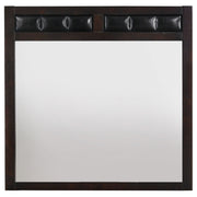 Address the furniture needs of your bedroom with this transitional 4-piece bedroom set that includes bed, nightstand, dresser, and mirror. Each piece is fashioned from durable solid wood for years of use and, except for the mirror, features stylish tapered legs. The bed comes with an imposing headboard and low-profile footboard, each upholstered in elegant leatherette padding, as is the top of the mirror. The drawers on the three case pieces are adorned with lustrous nickel hardware. This handsome bedroom set is the ideal way to express your style in your serene space.