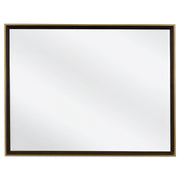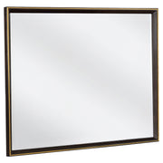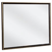 Create an interesting visual in a modern bedroom with the geometric features from this eastern king four-piece bedroom set. The high upholstered headboard adds depth and warmth with a smoked peppercorn finish. Versatile in style, this set is complete with a nine-drawer dresser and two-dresser nightstand and included shelf. Bring structure and personality to a room with the retro inspired details. Clean and elongated, the mirror looks great above the tall dresser.