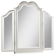 Elevate your beauty routine with the Evangeline vanity set, a trio of elegance featuring a desk with ample storage and built-in charging ports, a tri-fold mirror for perfect angles, and a chic stool with a plush seat. Each piece showcases a soft silver finish adorned with glittering trim and crystal-style knobs. The desk's felt-lined drawers protect your essentials, while the adjustable side mirrors of the tri-fold ensure precision in your beauty tasks. The stool's ivory chenille upholstery offers comfort and tucks away neatly to save space. This set blends glamour with functionality, making it an essential addition to any sophisticated dressing area.