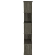 Purposeful imbalance tells a story. Designed with a whimsical profile, this bookcase brightens up a contemporary space. A visually pleasing arrangement of five tiers creates shelf space for books and decor. Finished in a cool weathered grey, it provides versatility and design power. Make this bookcase a focal point in a home office or casual room. Key Features: • Asymmetrical five-tier bookshelf in weathered grey laminate veneer • Offset shelf layout delivers artistic presence and visual rhythm • Crafted from engineered wood and scratch-resistant laminate • Compact vertical profile ideal for smaller home office setups • Versatile neutral finish coordinates with rustic or urban interiors • Includes tip-over restraint for enhanced safety and stability