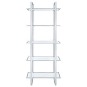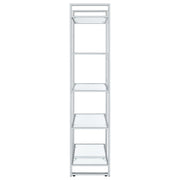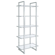 Create a well styled living space that radiates modern luxury. This contemporary bookcase delivers sleek lines of metal in your choice of gorgeous, polished finishes. The shelves are made with tempered glass for smooth, sturdy support. With five shelves total, it offers ample space to display photos, keepsakes, and more. Perfect for a living room, home office, or den, this fresh, modern bookcase is a fabulous choice for any home. Key Features: • Contemporary glass bookcase with five clear tempered glass shelves • Polished chrome frame creates a reflective and open visual effect • Electroplated metal structure enhances durability and shine • Tempered glass shelves offer strong support for books or display • Sleek vertical profile fits modern offices, dens, or studios • Includes tip-over restraint for secure placement in any room