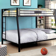 CLAREN Black Full/Queen Bunk Bed, 82 5/8"L X 62 3/4"W X 65"H, 131.1lbs. Simplistic full metal construction with a subtle contemporary feel! This black metal bunk bed offers ample sleep space for anyone while offering increased safety with its reinforced railings and an attached step ladder. Features: Contemporary Style Attached Ladder Full Metal Construction 22 Pc. Slats Top & Bottom Extra Support Leg Available in 3 Sizes Black