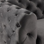SAPPHIRA Chair, Dark Gray, 43"L X 35 1/2"W X 27"H (SEAT HT: 19", SEAT DP: 24"), 79.9lbs. Take a look at this plush chair and imagine sinking into them after a long, hard day. Sit on the smooth seat cushions while you run your hands on the deeply tufted arms. Lean back and rest your head on the soft flannelette fabric while you pull a pillow closer and rest your arms on it. The striking looks are hard to ignore as well; its steel legs are polished in chrome to bring that irresistible modern appeal.