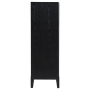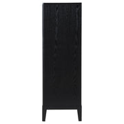 Add abundant clothing and accessory storage in a stylish bedroom with this modern five-drawer chest. Its compact profile fits virtually anywhere, while a chic look is created with fluted drawer fronts that add impressive dimensionality. A black finish imparts sophistication, while wire brushing creates a subtle sense of texture and depth. Each drawer front is adorned with a half-moon handle in a soft golden metallic finish that adds a perfect hint of warmth. The top drawer of the chest adds felt lining, perfect for protecting delicate items.