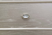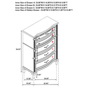 Elevate your guest room or main bedroom with this breathtaking glam chest. The space-saving tall design boasts a curvy front facade, seen throughout the wavy wood trim appointed drawer panels. Five spacious drawers offer ample space for all your bedroom necessities, along with a soft grey felt-lined top drawer for more delicate items. A silver oak finish covers the entire chest frame as slender glittering side panels lend a luxe modern flair. Hexagon-shaped knobs and hexagon-accented drop bail pulls offer a finishing touch.
