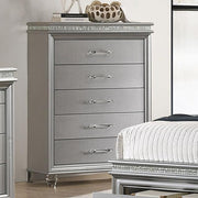MADDIE Chest, Silver, 37 5/8"W X 17 3/8"D X 54"H, 165.66lbs. Create a room with this chest from the Maddie Collection. The acrylic legs and crystal accents bring a glamorous aesthetic. Give into your glitzy side with this opulent chest.