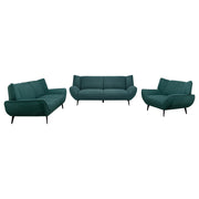 Bring the best of mid-century modern style to your casual space with this sofa set that inspires. This comfy and stylish teal blue set is a great choice for outfitting a living room or family room. Gorgeous fabric upholstery opens up possibilities for a lush palette choice. Flared arms and wing backs attach to non-removable seat and back cushions. Tapered black metal legs coordinate with the beautiful teal blue upholstery.