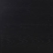 Introducing a beautiful dining room collection with clean, modern lines. The dining table boasts a oak veneer top with a black finish and a stunning tambour base design featuring fluted patterns on the double pedestal legs. The mid-century-inspired dining chairs have cushioned arms wrapped in durable charcoal grey fabric, offering comfort and style for any casual dining room.