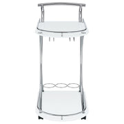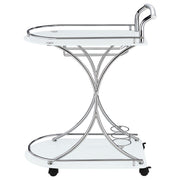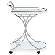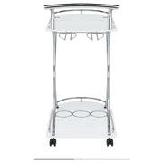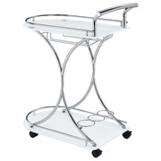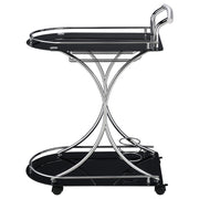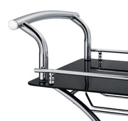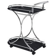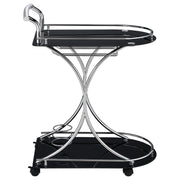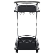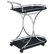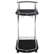 Recapture mid-century elegance with an enticing function. Slender construction elements form a graceful look in this mobile serving cart and add a lovely accent piece that's also useful for entertaining. Sleek black glass serves as a top and bottom shelf, contributing to an upscale flavor. Chrome finish metal accents round out a luscious palette. Serve and store with a pair of wine bottle holders and a stemware rack. Key Features: • Two-tier bar cart with black tempered glass shelves and chrome metal frame • Curved chrome silhouette creates sleek contrast against dark shelf surfaces • Integrated stemware rack and wine bottle holder keep essentials secure • Raised guardrails on each tier offer added safety while serving or moving • Smooth-rolling casters include locking function for stable placement • Crafted from steel and tempered glass for modern durability and style