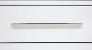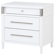 This three-drawer nightstand blends subtle curves with thoughtful convenience. Vertical metal accents and brushed nickel pulls contrast a white finish, while the felt-lined top drawer includes discreet cord access for device charging. Built from solid rubberwood, engineered wood, and a smooth laminate veneer, it offers smooth drawer movement and refined bedside storage in a compact silhouette. Key Features: • Three-drawer nightstand with curved edges and clean profile for modern bedside storage • White finish pairs with brushed nickel pulls and sleek vertical tube accents • Top drawer includes felt lining, tinted interior, and hidden cord access for charging • Drawer boxes feature dovetail joints and glide on 45mm heavy-duty metal runners • Built from solid rubberwood, engineered wood, and smooth laminate veneer • Fully assembled nightstand includes tip-over restraint for dependable bedside use
