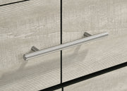 This contemporary bedroom set blends cool, modern style with rustic charm. Its Yin & Yang design pairs a rustic cream finish over engineered paper veneer with a sleek, floating bed. The headboard's padded, cream bouclé fabric adds softness, while polished nickel hardware brings shine. Crafted from asian hardwood and engineered wood, drawers feature English dovetail joinery and Center metal glide for durability. This set is chic, stylish, and full of unique details.