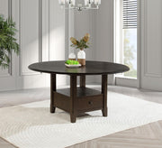 Create a stylish and functional dining area with this transitional round dining table. Featuring a spacious 60-inch tabletop in a rich, dark cocoa finish, this table makes a striking centerpiece for any dining room. The pedestal base includes two drawers for storing essentials and an open bottom shelf, perfect for displaying decor or keeping items within reach. With enough room to comfortably seat six, this elegant piece is ideal for both everyday meals and more formal gatherings, making it versatile enough for any occasion.