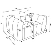 Introduce impeccable comfort and cozy vibes in your living room or den with a modern chair-and-a-half. This piece not only offers an extra-wide silhouette for the perfect curl-up spot but also features a fun bubble-like design that serves as the perfect interior focal point. The chair's wrap-around extra plush channeling with tufted accents on a waterfall bench seat adds an inviting warmth to your décor. It's further enhanced by wide corduroy accent pillows filled with premium down-like fill for lasting comfort. Upholstered in sand pebble boucle, this armchair offers a fresh, modern silhouette with piped armrests and channel tufting on the arms and back, creating a rich, inviting look that adds depth to your decor.