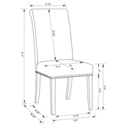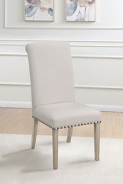 Appreciate the sophisticated look of a tall silhouette with fresh, inspiring style. This dining chair offers a versatile look that blends well with glass, wood, or metal tables. Transitional in motif, it combines invigorating modern touches with classic elements. A neutral upholstered wrap generates light, airy ambiance. Charming nail heads line the bottom of its seat edge, and narrow tapered legs with a neutral finish balance a stylish palette. Key Features: • Tall silhouette with fresh, inspiring style perfect for glass, wood, or metal tables • Transitional motif combining modern touches with classic elements • Neutral upholstered wrap creates light, airy ambiance • Charming nail heads line bottom of seat edge • Narrow tapered legs with neutral finish balance stylish palette