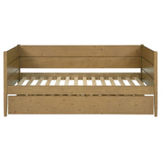 The transitional-style panel daybed with trundle features a natural brown finish that highlights its rustic charm and versatile appeal. Constructed from pine wood, plywood, MDF, and pine veneer, this piece combines durability with timeless design. The natural wood variations, interacting with the applied finish, make each piece truly unique. Included slats provide sturdy mattress support, while the trundle, equipped with four wheels, glides smoothly for convenient additional sleeping space.