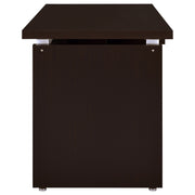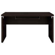 This modern computer desk blends sleek design with practical features for a sophisticated workspace. Constructed from durable engineered wood with a wood-look laminate veneer, it offers both style and functionality. The floating top design adds a contemporary flair, while the keyboard tray provides easy access to essential devices and accessories. Finished in a rich, versatile tone, this desk is perfect for home offices, providing a clean and minimalistic aesthetic with ample work space for your computer, documents, and more. Key Features: • Sleek computer desk with a contemporary floating top design for modern style • Built from engineered wood with a wood-look laminate veneer in a cappuccino finish • Features a convenient pull-out keyboard tray for easy access to your devices • Offers ample workspace for computers, documents, and office supplies • Simple, clean lines make it ideal for both home and office environments • Sturdy construction ensures lasting durability and stability for daily use