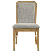 This mid-century dining set combines sculptural elegance with practical performance. The fixed-top table features a recessed ceramic surface with marble-like tones framed in solid wood, offering an impermeable, heat-resistant, and easy-to-clean finish. Slatted angular legs add architectural flair. The side chairs provide plush grey upholstery, curved backrests for support, and gently rounded frames. Crafted for comfort and durability, this set seats six with effortless style. Key Features: • Dining set with recessed ceramic tabletop and grey upholstered curved-back side chairs • Tabletop features marble-look tones and is heat resistant, stain resistant, and easy to clean • Solid wood frame and softly curved edges add durability and vintage-inspired charm • Slatted angular legs bring mid-century character with a sculptural foundation • Chairs feature plush grey fabric and rounded posts for comfort and subtle detail • Crafted from solid rubberwood, ceramic composite, engineered wood, fabric, and foam