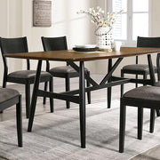 OBERWIL Dining Table, 71 3/4"L X 38"W X 29 3/8"H, 99.2lbs. This eye-catching set will bring a modern touch into your dining space. The thin single-panel top is warm and smooth in its antique oak finish, supported by round tapered legs. Staying true to any mid-century modern piece, the legs are angled and so are the chair backs, contoured and painted in black. From the striking contrast between these two colors and the interplay of curves and straight lines, a gorgeous piece is born--created to not only be the centerpiece of your home, but also a bold statement piece that will keep your guests talking.
