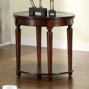 Granvia Dark Cherry End Table, 25"DIA X 24"H, 46lbs. With gentle styling these occasional tables will be a sophisticated accent to the rest of your living room. Finished in dark cherry each table has a beveled glass top and attractive turned legs. The open bottom shelves bring convenience for storage o r display. Features: Beveled Glass Top Solid Wood, Wood Veneer, Others Turned Legs Dark Cherry Finish Open Bottom Shelf