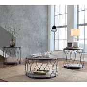 Hawdon Gray End Table, 24"DIA X 24"H, 31.02lbs. This is the perfect end table look for your industrial or farmhouse inspired decor. The metal frame has been twisted into a chain link fence design. The wrought metalwork is matched with gray finished wood that feels worn and right at home with your aesthetic. Features: Twisted Metal Frame Open Bottom Shelf Weathered Wood Details