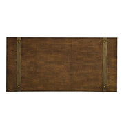 The dark oak finish blends well with the rustic metal legs and band across the top of these occasional tables. Nailhead accents give them a coastal look. An open shelf provides storage for magazines and books.