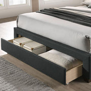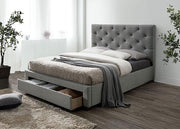 SYBELLA Cal.King Bed, Beige, 91"L X 74 5/8"W X 46 1/2"H, 182.6lbs. Comfort and functionality are the hallmarks of this fully upholstered, mattress-ready bed. On the comfort side, there's the rich linen-like fabric that wraps around the frame of the bed, culminating in a simple rectangular headboard with beautiful diamond tufting. Functionality-wise, the foot end of the bed is a smooth rolling drawer with casters; it's the perfect storage spot for any extra pillows or beddings within arm's reach.