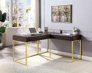 FREIBURG Corner Desk, Walnut, 56 3/4"L X 64"W X 30 1/2"H (UP TO 41 1/4"H), 135.1lbs. A wooden frame and metal base harmoniously blend to fit your space. The matte gold finish, with its simple shape and dainty silhouette is in striking contrast with the darker tones of the frame. Front panels are adorned with patterns that conceal the drawer, which open smoothly on ball-bearing glides. To further expand the piece, the right side desk has a lift-top mechanism that allows any health-conscious worker at home unparalleled productivity.