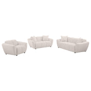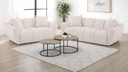 Plush, sculptural, and undeniably bold, this modern sofa set showcases chunky silhouettes wrapped in soft greige chenille. Wide splayed arms frame deep, channel-tufted contours, while attached waterfall seats are built with pocket coil construction for long-lasting support. Textured upholstery adds dimension to the grid-like shaping, offering a refined yet cozy aesthetic. Complete with matching knife-edge accent pillows, this sofa set blends form and function with contemporary ease. Key Features: • Modern sofa set in greige chenille with splayed arms and bold grid-style channel tufting • Attached waterfall seats feature pocket coil construction for comfort and support • Chunky silhouettes deliver sculptural impact and plush, lounge-ready proportions • Textured chenille upholstery offers soft hand-feel and subtle tonal variation • Includes matching knife-edge accent pillows for a finished, cohesive look • Built from rubberwood, plywood, and foam for dependable everyday durability