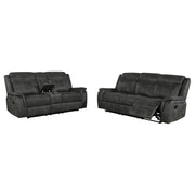 This reclining sofa set delivers the perfect balance of comfort and function. Upholstered in performance-grade microfiber, each piece features padded arms, tufted backs, and pocket coil cushions with cool gel memory foam for lasting support. Smooth manual reclining mechanisms provide ease of use, while wall-hugger designs save valuable floor space. A lift-top console with built-in cup holders adds convenience, making this set an inviting choice for relaxation and everyday use. Key Features: • Two-piece reclining sofa set in charcoal microfiber with padded arms and tufted backs • Manual reclining seats provide smooth operation for everyday relaxation • Wall-hugger design allows reclining while conserving valuable floor space • Pocket coil cushions with cool gel memory foam regulate comfort and support • Loveseat console includes lift-top storage and dual stainless steel cup holders • Performance-grade microfiber upholstery ensures softness and durability