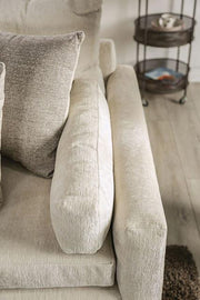 To say that this sofa set is immaculate is an understatement. The neutral tones and simple silhouette lends to the focus of the piecethe warm ivory chenille that wrap the set. With padded cushions on the inside, the track arms provide support, while the oversize back pillows are loose and comfortable. To top it off, pillows in solid and graphic light gray are included for a classic contemporary look.