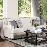 This loveseat's design is understated and elegant. The large nailhead trim and restrained visual elements like fitted back pillows, low track arms, and bracket feet give this piece a touch of country. The patterned pillows offer a contrast and inspiration for your accompanying room Decor. Use this loveseat to bring that touch of country into your home.