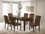GARNETT Side Chair (2/CTN), 18 1/8"W X 22 1/4"D X 39"H (SEAT HT: 19 1/8", SEAT DP: 19 1/4"), 34.1lbs. Sometimes, sophistication comes in simple packages with outstanding details. There is nothing too out-of-the-ordinary about this dining collection, besides the fact that the chairs feature a unique spine-like construction, which brings an unexpected twist to the standard back design. Seat cushions are upholstered in fabric-like vinyl and the frame is finished in a lovely, warm walnut color.