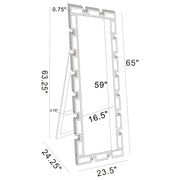 Check your fashionable ensemble with this charming, modern glam cheval mirror. A sophisticated frame of open rectangles and squares surrounds the main mirror, lending a Greek key-inspired silhouette for a classical aesthetic. Each sleek, boxy shape is covered in a mirror trim tile designed with a subtle bevel edge for a hint of texture and extra dimension. A rear kickstand leans the cheval mirror backward ever so slightly, allowing you to see your whole look before stepping out for dates and workdays. Place this elegant cheval mirror in your bedroom to create an instant dressing area. Key Features: • Standing floor mirror with full-length design and bold geometric frame • Segmented mirrored overlay adds layered dimension and structure • Abstract pattern detail creates visual movement across the border • Ideal for dressing areas, bedrooms, or modern foyers • Freestanding silhouette supports easy repositioning within space • Made from engineered wood and mirror materials for strength and shine