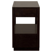 Inspire a retro feel in a modern bedroom with this stunning two-drawer nightstand. Elongated metallic drawer pulls protrude from flat drawer fronts, inspiring a sleek look. In a rich and warm smoke peppercorn finish, the deep hues of the silhouette create a bold visual. The simple and smooth frame creates a structured effect, complete with a smooth base that reaches the floor. Store your bedtime books or favorite sculptures on the shelf between the drawers to add depth to your space. Key Features: • Two-drawer nightstand in a rich smoke peppercorn finish for a modern bedroom • Features elongated metallic drawer pulls for a sleek, retro-inspired look • Constructed with a simple and smooth frame for a structured aesthetic • Includes a shelf between the drawers for additional storage or display space • Stands on a smooth base that reaches the floor, enhancing its bold visual appeal