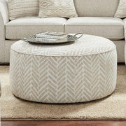 SALTNEY Ottoman, 39"L X 39"W X 18"H, 32lbs. It's everything an Ottoman should be - broad, round, firm and soft - perfect for use in any room. The two-tone artful array of arrowhead / feather-like imprints boasts a pleasant contrast. Singular cord welt trim circles the buoyant and comfortable surface, a favorite for casual sitting or leg-resting. Easy portability satisfies a variety of demands and uses.