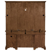 This burnished oak credenza with hutch is bound to enhance your office space. Stately and traditional in style, there is plenty of storage space with five drawers, two top cabinets, and two lower cabinets that lock for safekeeping. Crown molding detailing and paneling make for a magnificent display. Supportive bracket style feet provide stability and an attractive upgrade for this wood credenza. Include this piece in your traditional style office space. Key Features: • Executive home office collection finished in burnished oak • Features felt lined top drawers, 45mm full extension ball bearing glides, and bronze hardware • Credenza includes a power outlet (2AC/2USB), center keyboard drawer, two top drawers and middle drawer with removable dividers, one lockable file cabinet, and a cabinet with an adjustable shelf • Hutch includes a single drawer, two cabinets with clear tempered class door panels, and two adjustable shelves • Constructed with rubberwood, plywood, MDF, particle board, and white oak veneer