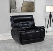 Commanding comfort and tailored power define this leather dual power recliner chair. Upholstered in black top grain leather everywhere the body touches, it features dual power controls for independent adjustment of the headrest and footrest. A built-in control panel includes dual USB ports with both USB-A and USB-C for effortless charging. Channel tufting and contrast stitching add refined dimension to its bold, supportive form. Key Features: • Dual power recliner with independent headrest and footrest adjustment functions • Top grain leather where the body touches offers a smooth, high-end seating feel • Control panel includes dual USB ports with USB-A and USB-C for device charging • Channel tufting adds support and visual texture to seat and backrest zones • Contrast stitching outlines the form with modern, tailored definition • Plush padded arms and deep cushioning provide full-body relaxation and support