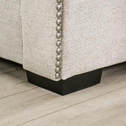 LAREDO Sofa, Beige, 100"L X 44"W X 40"H, 125lbs. The transitional appeal of this sofa and love seat combo is hard to ignore. Borrowed classic elements like the rolled arms and nailhead trim are combined with a more modern approach to comfort--the loose backs are removable and plush, while the throw pillows are bright and colorful. With a slight sheen to them, the blue tones on the accent pillows pop against the beige line-like fabric, which just might be the needed flair to take your living room decor a notch higher.
