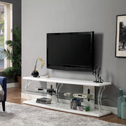 Ernst White/Clear 60" TV Stand, 60"L X 18"W X 21 3/4"H, 103.4lbs. Your top of the line entertainment needs an ultra modern housing. Acrylic posts light up hold up a central glass shelf and a high gloss finished top shelf. This piece shines with a cutting edge aesthetic, and to take things over the top LED lights ar e implemented to light up the acrylic posts, giving it a sci-fi look and setting the mood in your living room. Features: Contemporary White Glass, Acrylic, Replicated Wood, Others 8mm Tempered Glass Shelf Acrylic Posts High Gloss Lacquer Coating Rear Wiring Access