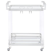 A serving cart is a delightful accoutrement for any home bar or indoor patio. This serving cart takes it to another level with an acrylic and metal frame finished in chrome. It features clear tempered glass shelves that's simple yet modern. Bottom shelf features wine bottle holders while top shelf features a stemware rack underneath. With convenient wheels, take this serving cart wherever drinks are in demand. Key Features: • Clear acrylic posts add a touch of modern to this serving cart • Chrome finish enhances forward looking design • Two (2) tiers of clear tempered glass shelving accentuates minimalist design • Stemware rack, three (3) bottle wine rack, and casters are among the functional features • Steel, acrylic, and glass construction