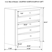 Keep your bedroom organized with this five-drawer chest that blends transitional style and practical design. Finished in a sleek black tone, it features chambered drawer fronts for a sculpted, dimensional look accented by brushed nickel hardware. The spacious drawers glide smoothly, providing ample storage for clothing, linens, and accessories. Built from rubberwood, engineered wood, and okume veneer, this durable chest brings lasting quality and refined simplicity to any bedroom setting. Key Features: • Five-drawer chest with sleek transitional silhouette and finish • Chambered drawer fronts add sculpted depth and dimensional style • Smooth-gliding drawers provide ample everyday storage capacity • Brushed nickel hardware adds subtle metallic contrast and shine • Constructed from rubberwood, engineered wood, and okume veneer • Ideal for organizing clothing, linens, and essential accessories