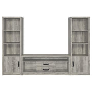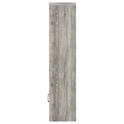 Tall and slender, this modern media tower is the perfect complement for your entertaining needs in both compact and larger spaces. Organize media, books, and implements on shelves and interior shelves, staying organized and uncluttered. Melamine construction features a distressed weathered gray finish with grain-like markings, offering rustic vibes. Find space on three fixed shelves and one adjustable shelf, all ready to separate and store gaming supplies, media, or books. A single black finished metal hardware pull offers an ideal match. Key Features: • Modern media tower suitable for various space sizes • Organize effortlessly with shelves and interior compartments • Distressed weathered gray finish for rustic charm • Three fixed and one adjustable shelf for versatile storage • Single black-finished metal hardware for a cohesive look